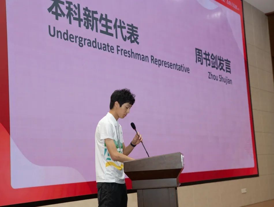 研究生新生代表曹珺岩以全英文发表入学感言,用机遇与信心两个关键词自勉,希望在国际化交流平台中抓住每一个机遇,以自信奋进的姿态不断提升自我。