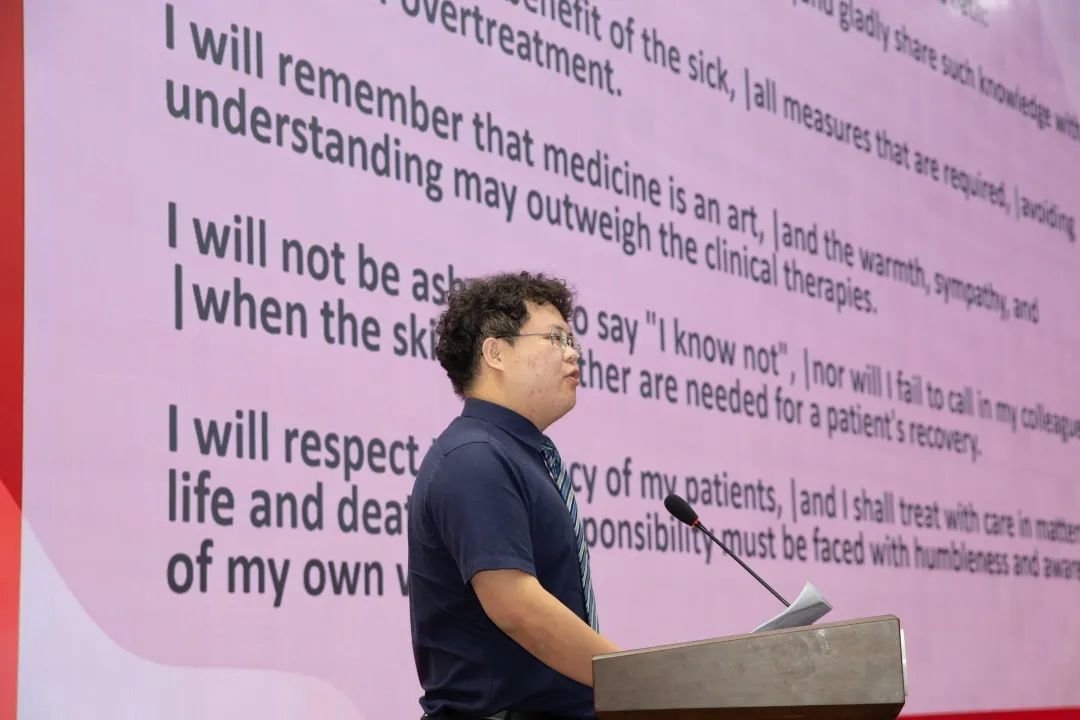 本科新生代表周书剑来自首都北京,他以新时代下北京青年医护们志愿奉献的精神讲起,立志自己要以青春姿态奋斗进取,表达了“路漫漫其修远兮,吾将上下而求索”的志向。