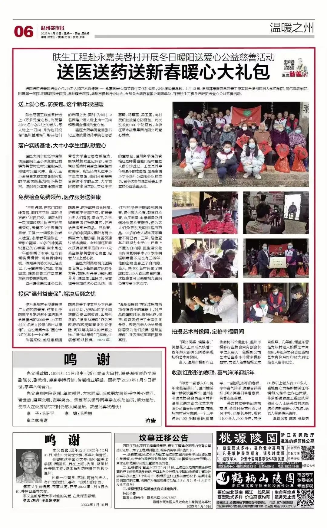 白求恩志愿者服务社赴永嘉县芙蓉村参加“肤生工程”爱心义诊活动,与学校药学院、附属第一医院、第二医院、眼视光医院,温州都市报陈忠慈善工作室、温州曙光医院、温州市摄影行业协会的专家一道,为当地群众送医送药送健康,送上新春的第一抹温暖。