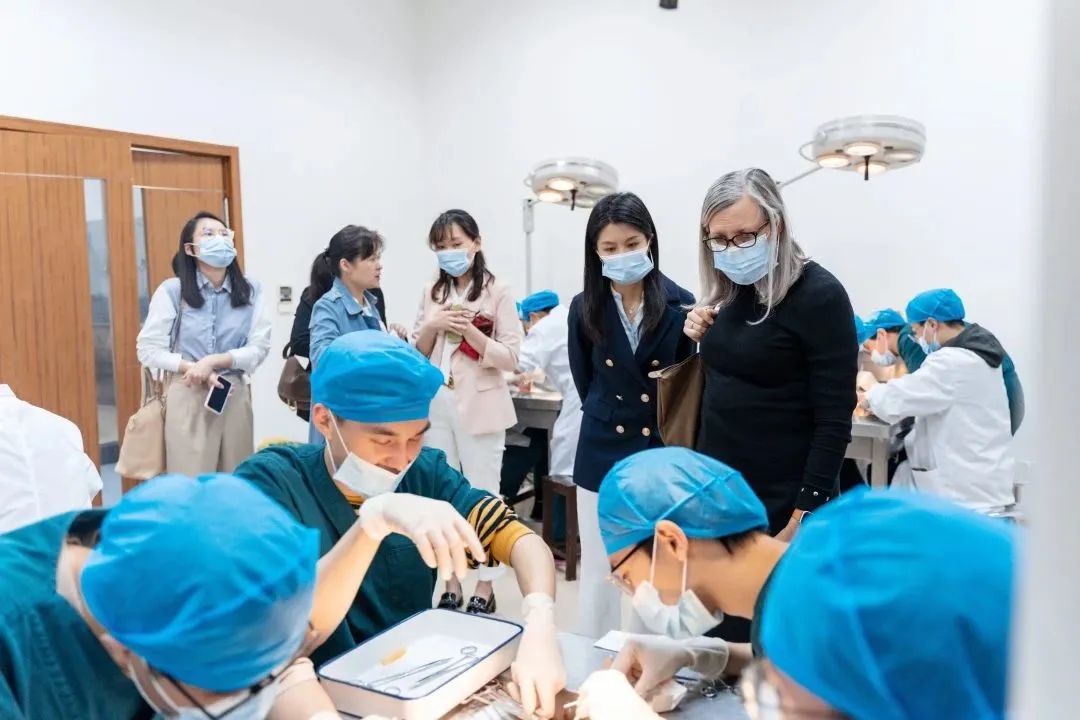 4月10日上午,在色色视频 临床技能实验教学中心,阿尔伯塔大学医学与牙学院联合学院主任兼色色视频 外方执行长特雷西·希利尔(Tracey Hillier)及阿尔伯塔大学项目协调员王娴女士现场观看了色色视频 2020级学生的《外科手术学》课程操作过程。