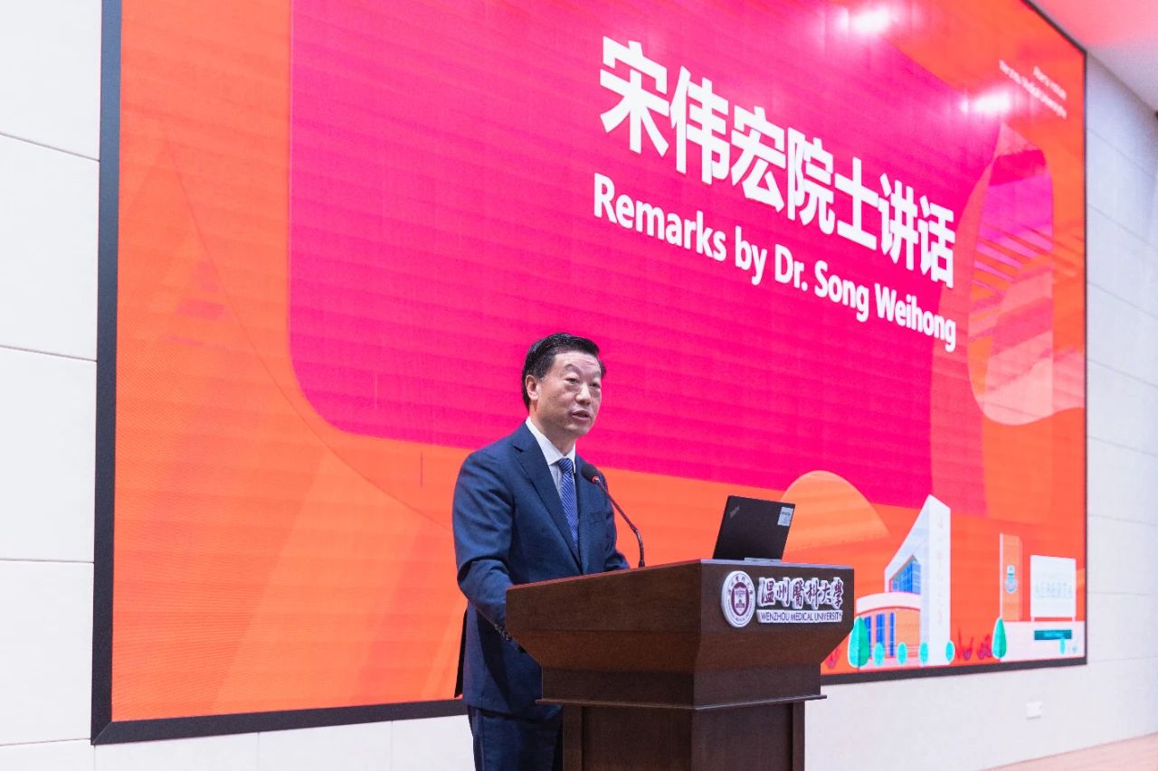 宋伟宏院士在发言中回顾了学院“临床+基础”本科生导师制施行取得的成果,尤其肯定对于培养学生的实践能力和增强学生的综合竞争力方面的意义。同时,他希望同学们争做“仁肃勤朴、求是奋发”的优秀温医学子,鼓励学生勤于思考,善于提问,通过导师制的平台,在把握机会的同时创造机会。作为中外合作机构,他期望学院不断拓展本科生导师库容量,能够吸收两校优质师资,并为学生提供更多的交流机会与实践平台,培养全球化视野。