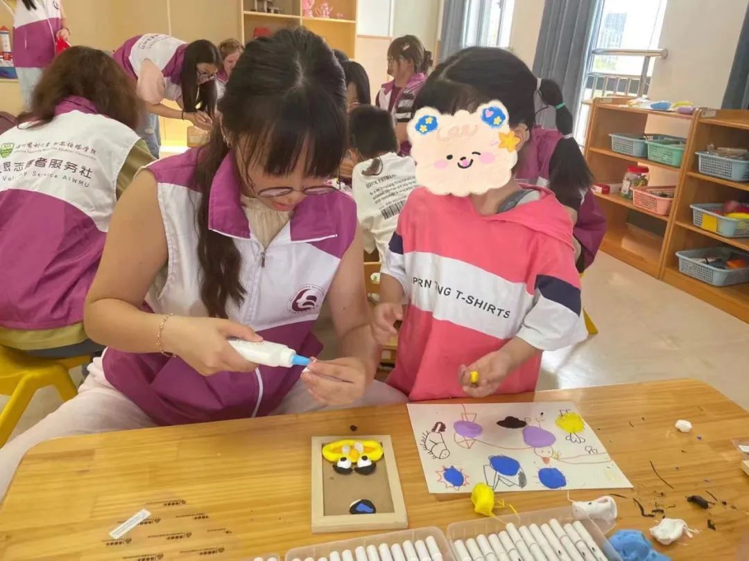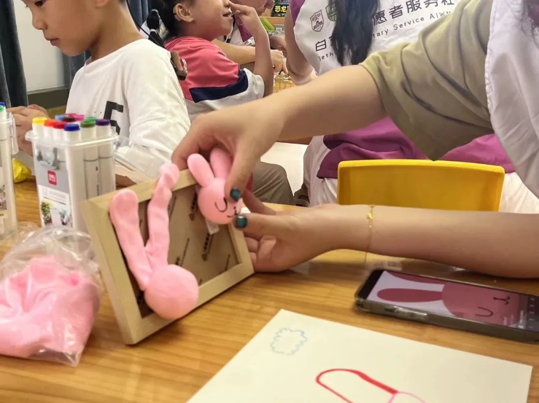在制作超轻黏土装饰画的这一环节,孩子们充分发挥创意,从构思图画、选择颜色、动手制作,在志愿者的耐心协助下,完成了一幅幅令人印象深刻的装饰画作品。一同遨游在艺术海洋的过程中,也让志愿者感受到孩子们的极为丰富的创造力与想象力。Pamela教授作为人文方向研究者,也在孩子们制作装饰画的环节收获了满满惊喜,为志愿者的心意和孩子们的创意点赞!