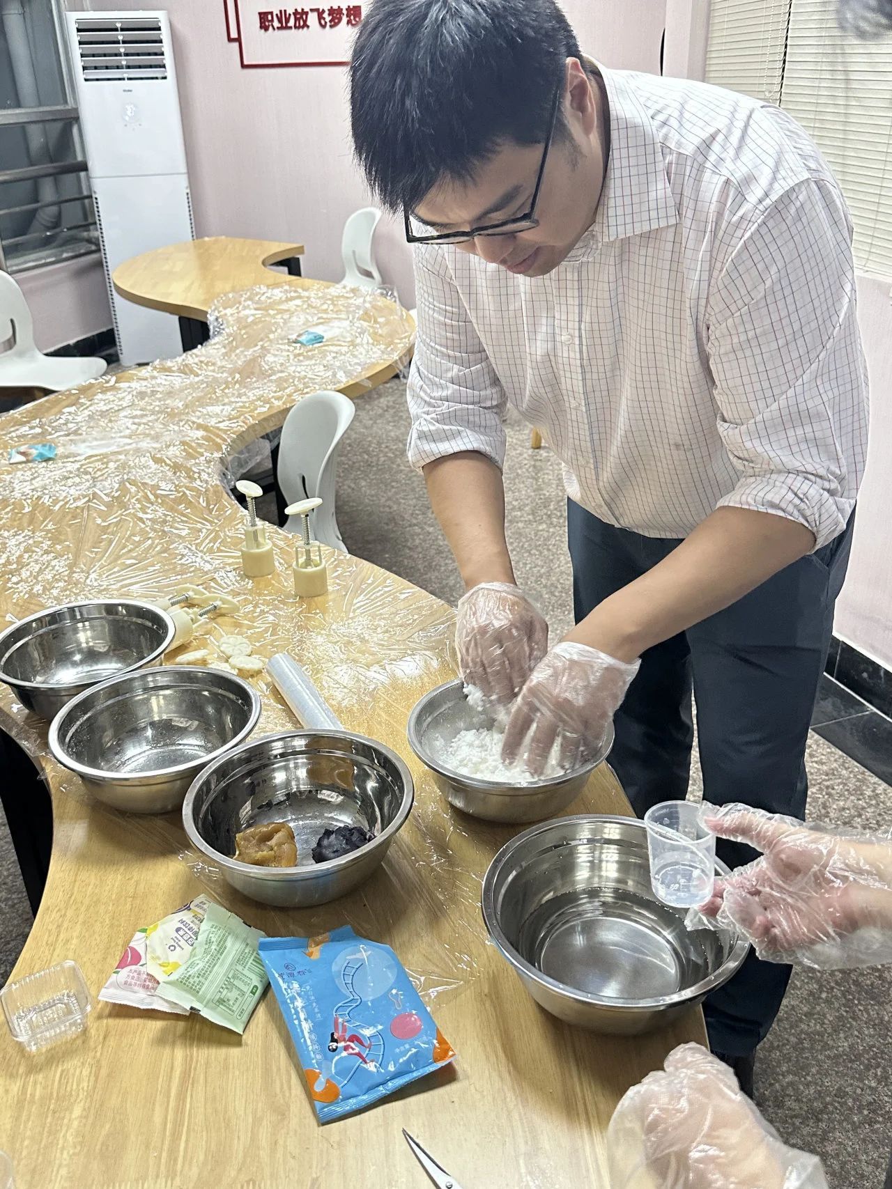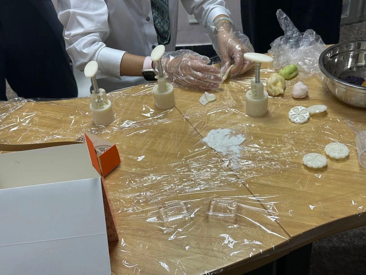 很特别的是,今年的月饼DIY活动有幸邀请到了加拿大阿尔伯塔大学的教师代表Hollis Lai教授和Xian Wang老师。在和同学们的共同尝试和探索下,两位老师很快掌握了月饼的制作要领,分工合作,制作出了很多精美的月饼,因为两位老师的幽默和亲和,现场满是欢声笑语。老师们说,在一起制作月饼的过程中,充分体会到了中秋的浓厚氛围,下午同学们能将这份中国的传统文化继续传承、传播。