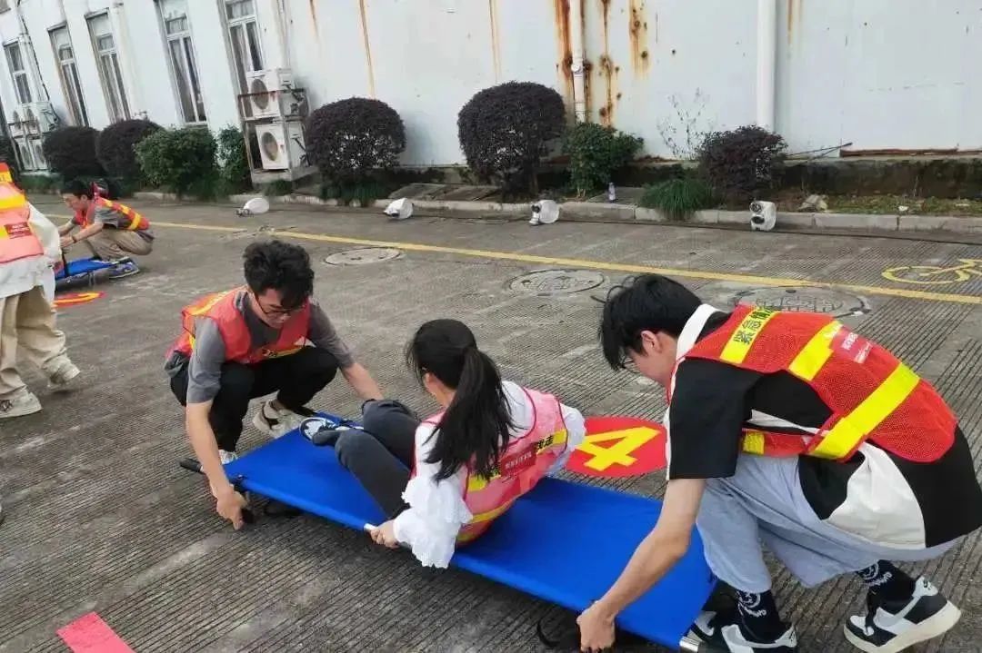 一人扮演火场被困人员,另两人作为“救护人员”,用担架将被困人员抬出,参赛队员们齐心协力,最终快速平稳的就出被困人员。