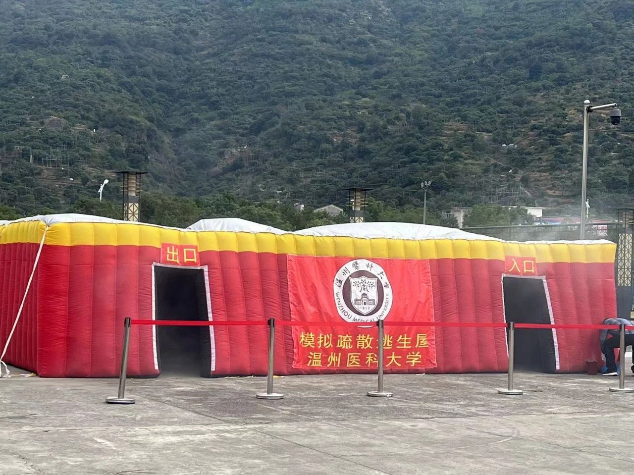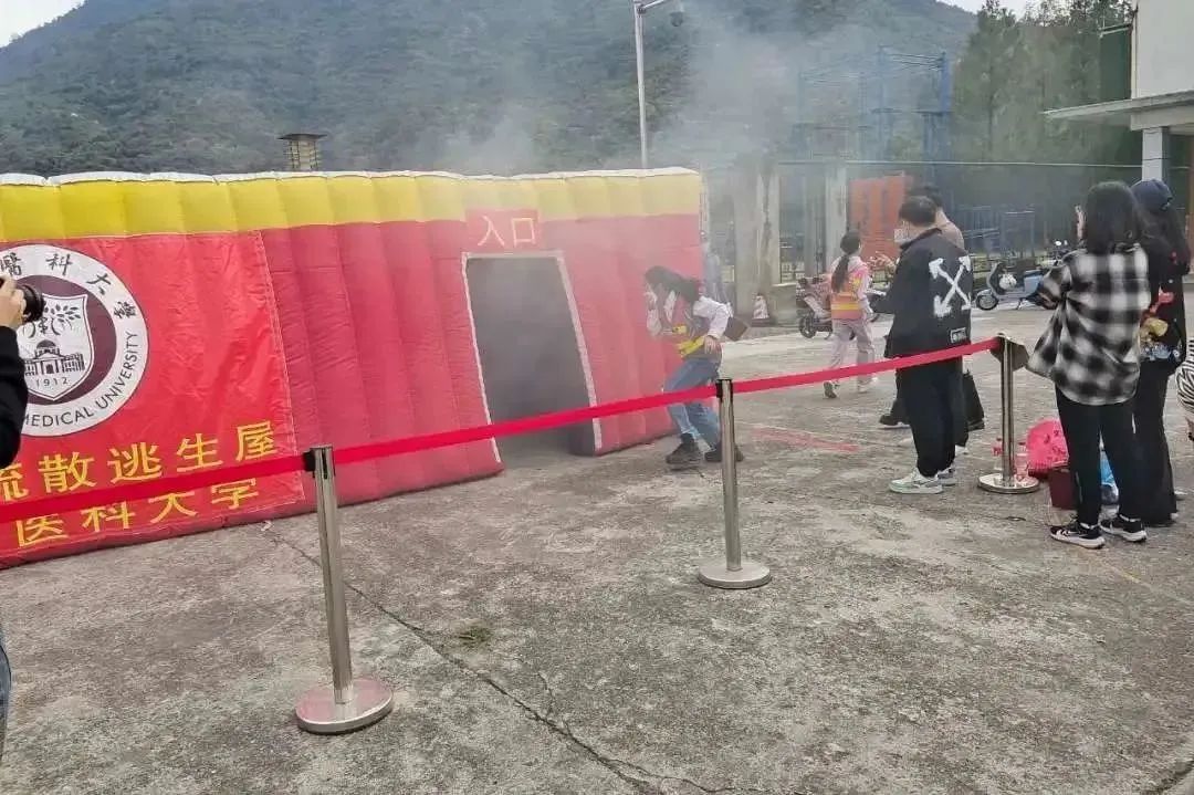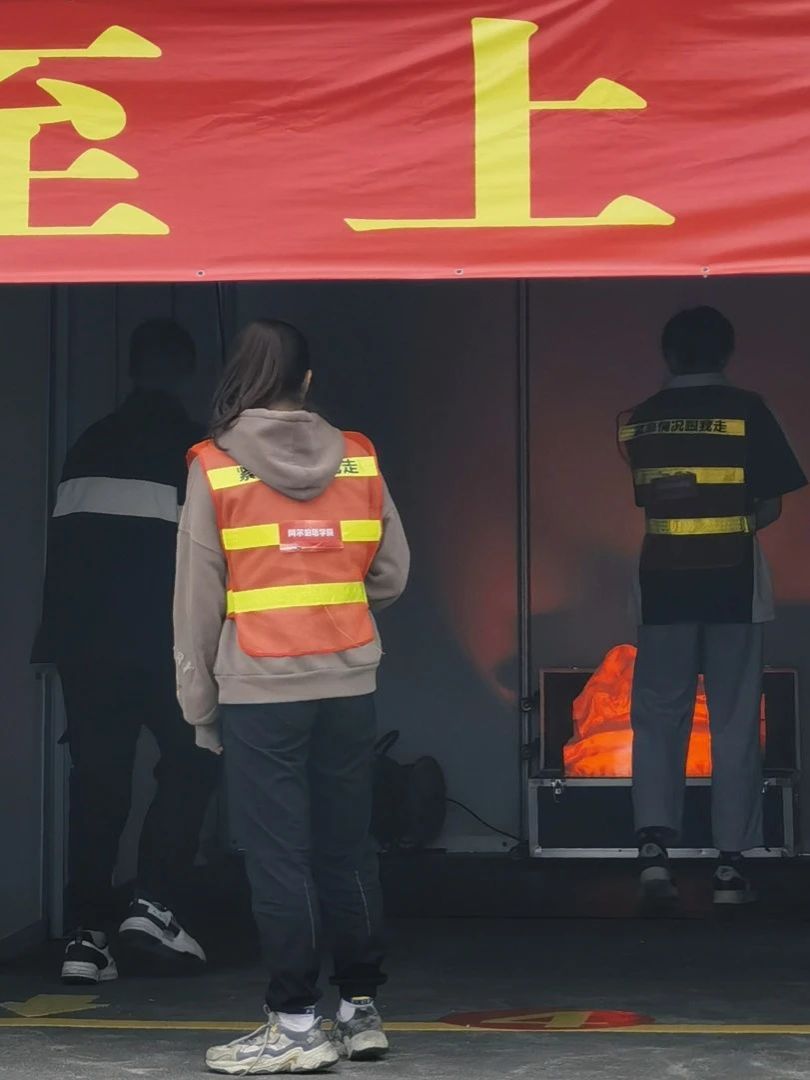 阿院派出三位勇士,接力进入模拟逃生屋。从起点开始,参赛队员迅速地取一张小方巾折叠3次,捂住口鼻,采用匍匐姿势进入。模拟逃生屋内散发出的虚拟浓烟,让大家真切感受到了火灾的可怕,但如何在紧迫的情况下脱险,才是最重要的。