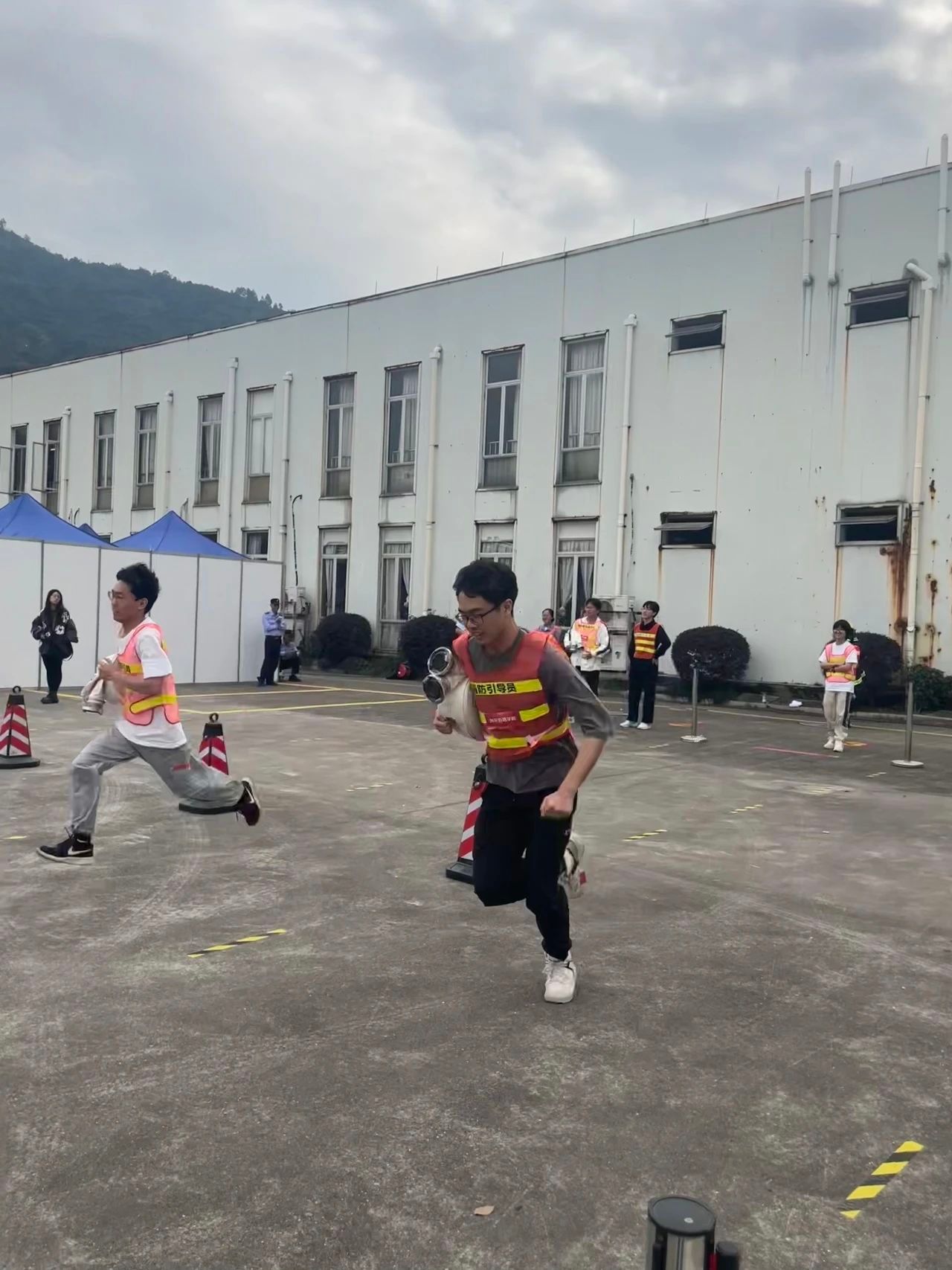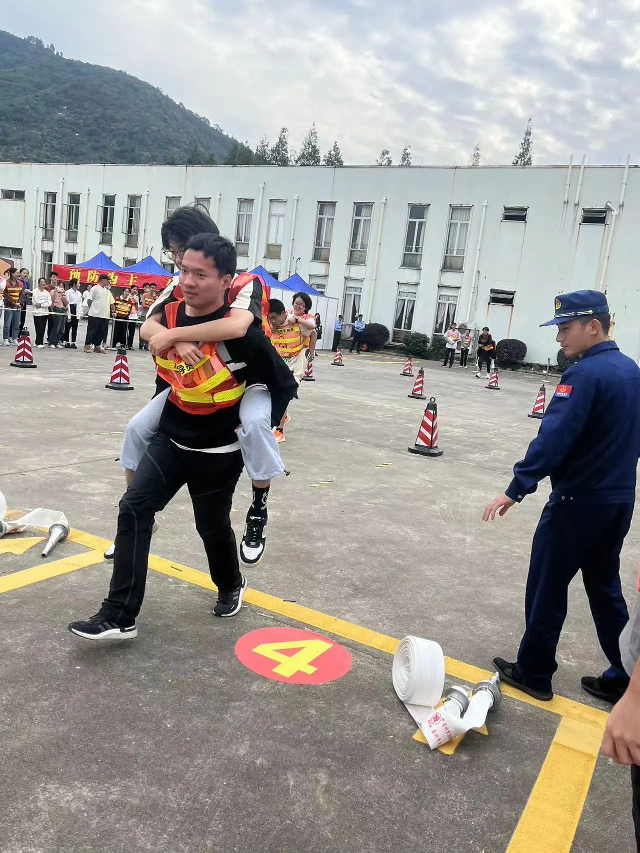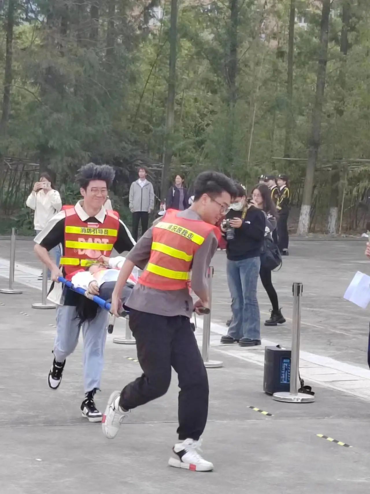 重头戏来啦,四人完成三棒接力!三位阿院队员们分别穿好消防服、接好水枪、穿越障碍以背或者抱的形式救出“被困人员”,最后在保证救援安全且平稳的情况下,尽可能快速地冲向终点。通过这场游戏我们也体会到了消防员的不易,也在这场比赛中取得了全场最佳的好成绩。