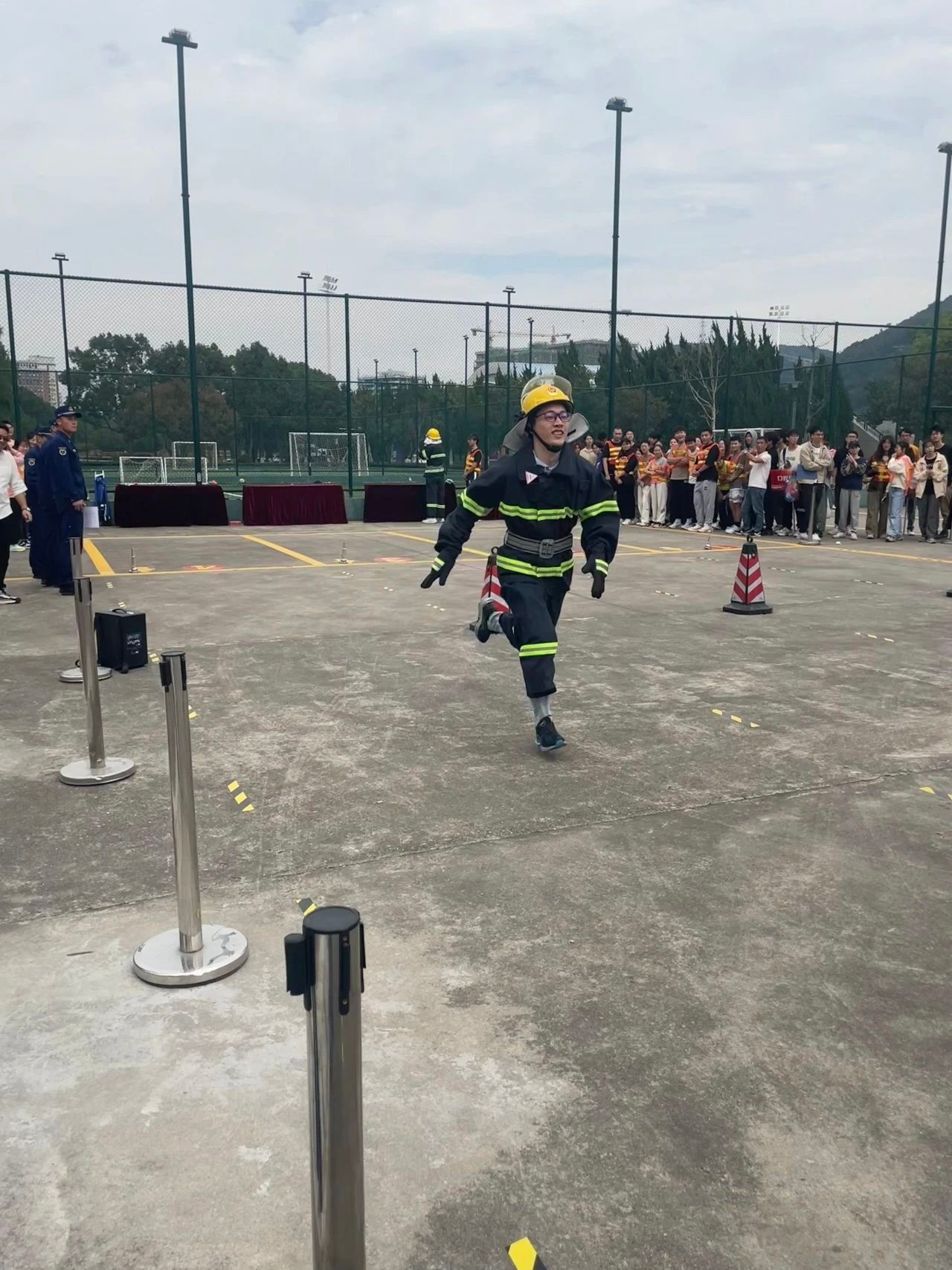 在开幕式上,阿院学子认真聆听老师和消防队长的讲话。此次消防趣味运动会共设置英雄救美、接力灭火、重装出击、火场逃生四个比赛项目,将灭火、逃生及救援技能融入项目之中,让同学们在轻松愉快的运动中学习安全知识,掌握消防技能。