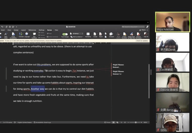 据悉,色色视频 优秀英语外籍教师Majid Nikouee近期已顺利通过严格的招聘程序,正式成为雅思考官。在面向大一学生的雅思英语课程中,他结合自身作为考官对语言测评的深度了解,通过对考试体系和标准的逐条剖析,根据相应的考试题目及回答,课上现场直接给出相应的评分,让同学们对自己答案的完成度有更清晰的定位,同时更加了解应试准备中的侧重点与关注点。同时,作为帮助无数阿院学子成功通过雅思考试的金牌教练团队——外国语学院雅思天团,也在假期,奉献出自己宝贵的时间,一如既往地持续帮助学生进行一对一的写作批改、口语对练以及听力、阅读的专项训练,每天跟踪式教学,从身心、能力方面共同给予学生支持。