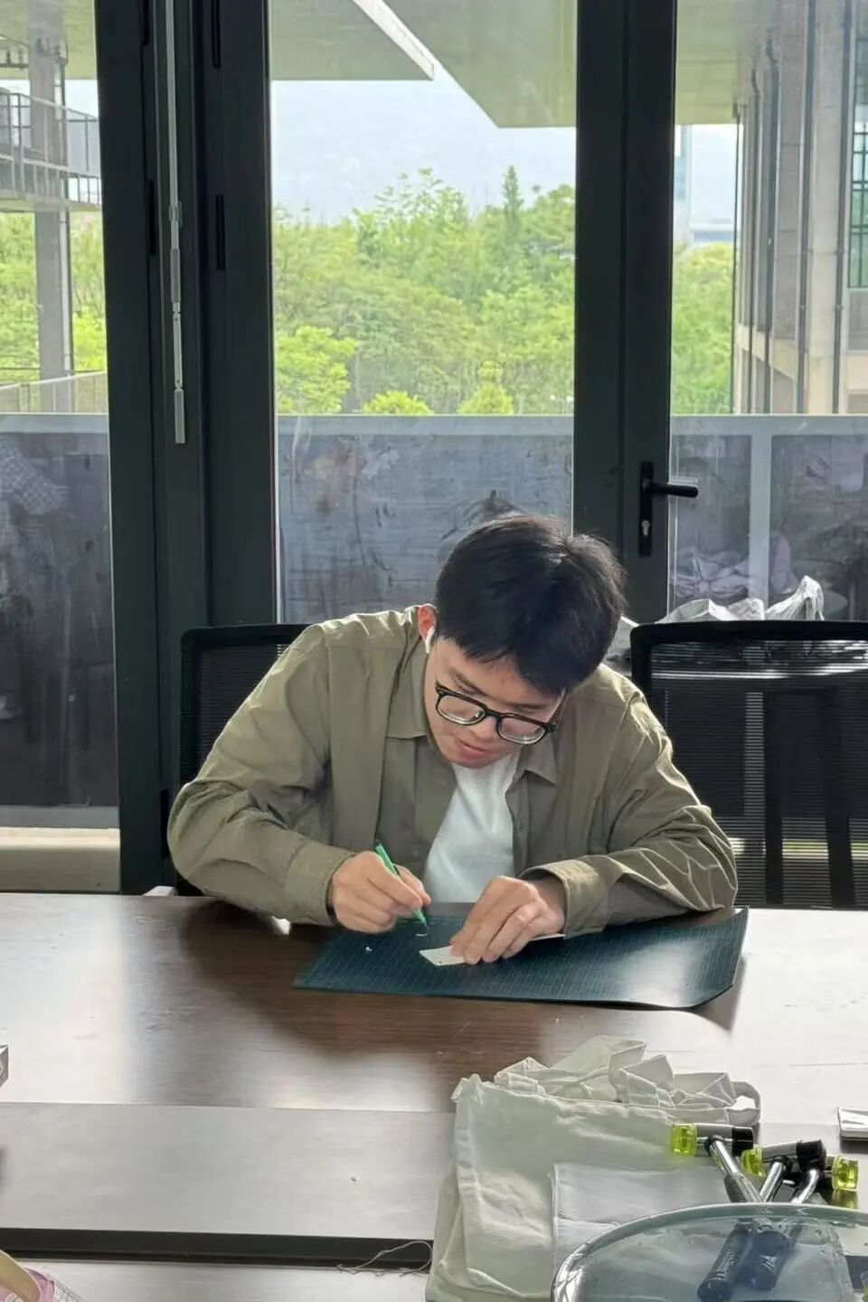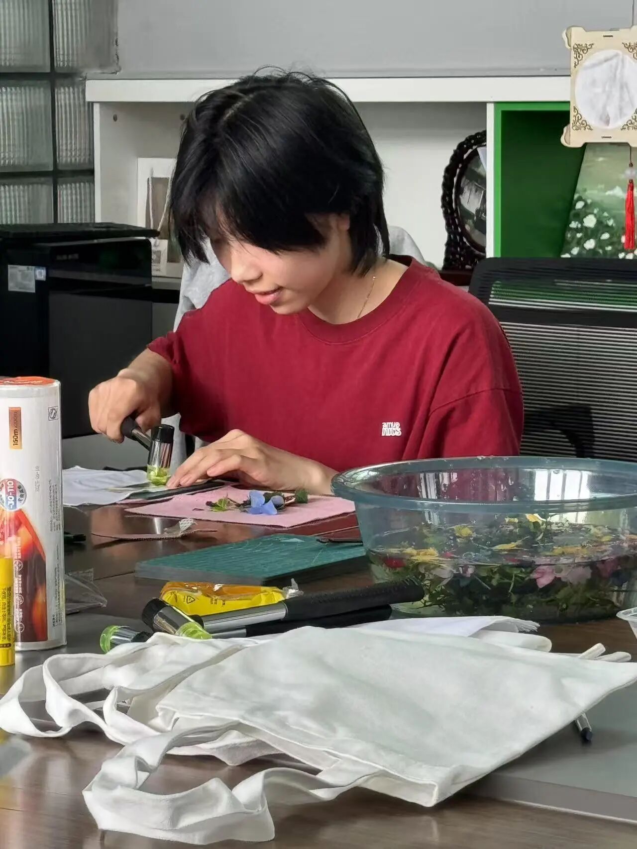 阳光掠过桌面,所有拓印都泛起细碎的光泽,那是植物纤维与棉麻织物彼此咬合的痕迹,是自然用季节脉络写下的抒情诗。