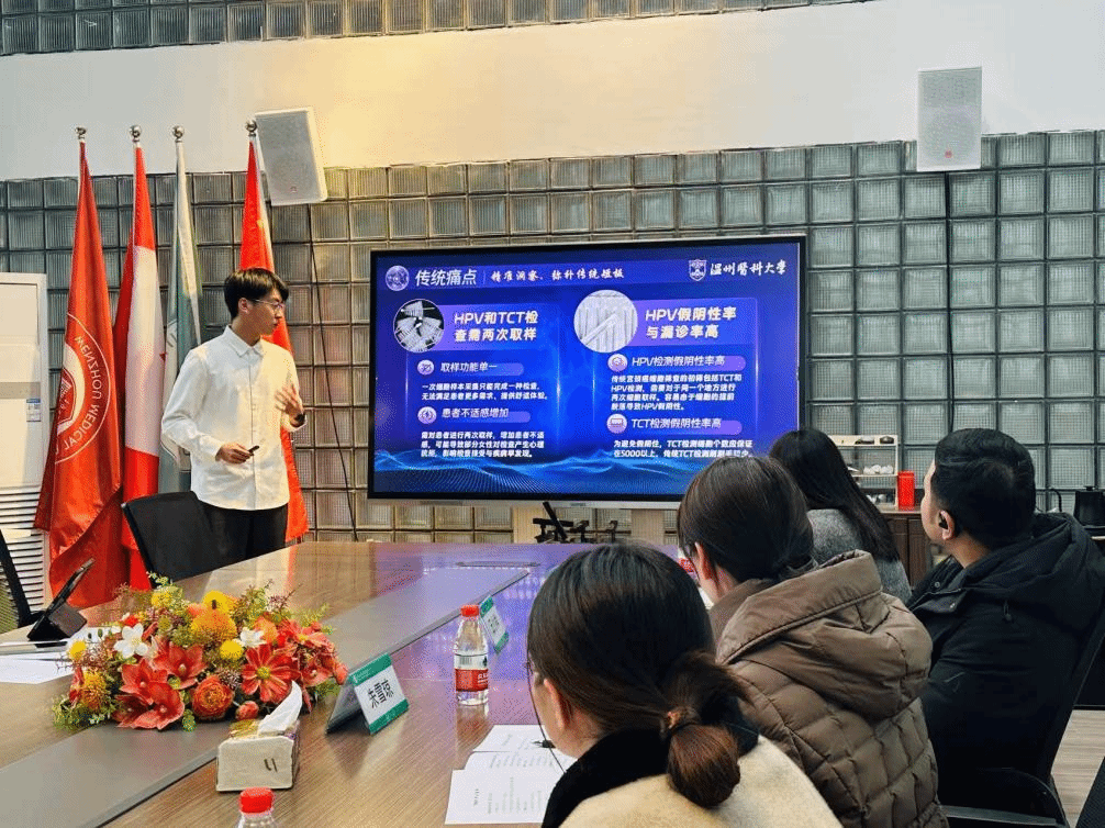 各参赛团队依次汇报研究项目,包括《CD2AP对胃癌细胞转移的调控及作为生物标志物建立预后模型》(许隽尔)、《肢体残障人士就业现状与非遗助残干预体系研究——基于浙闽部分区县调研》(张晓睿)、《智护宫颈——创新型改良宫颈刷的精准诊疗先锋》(陈佳如)。