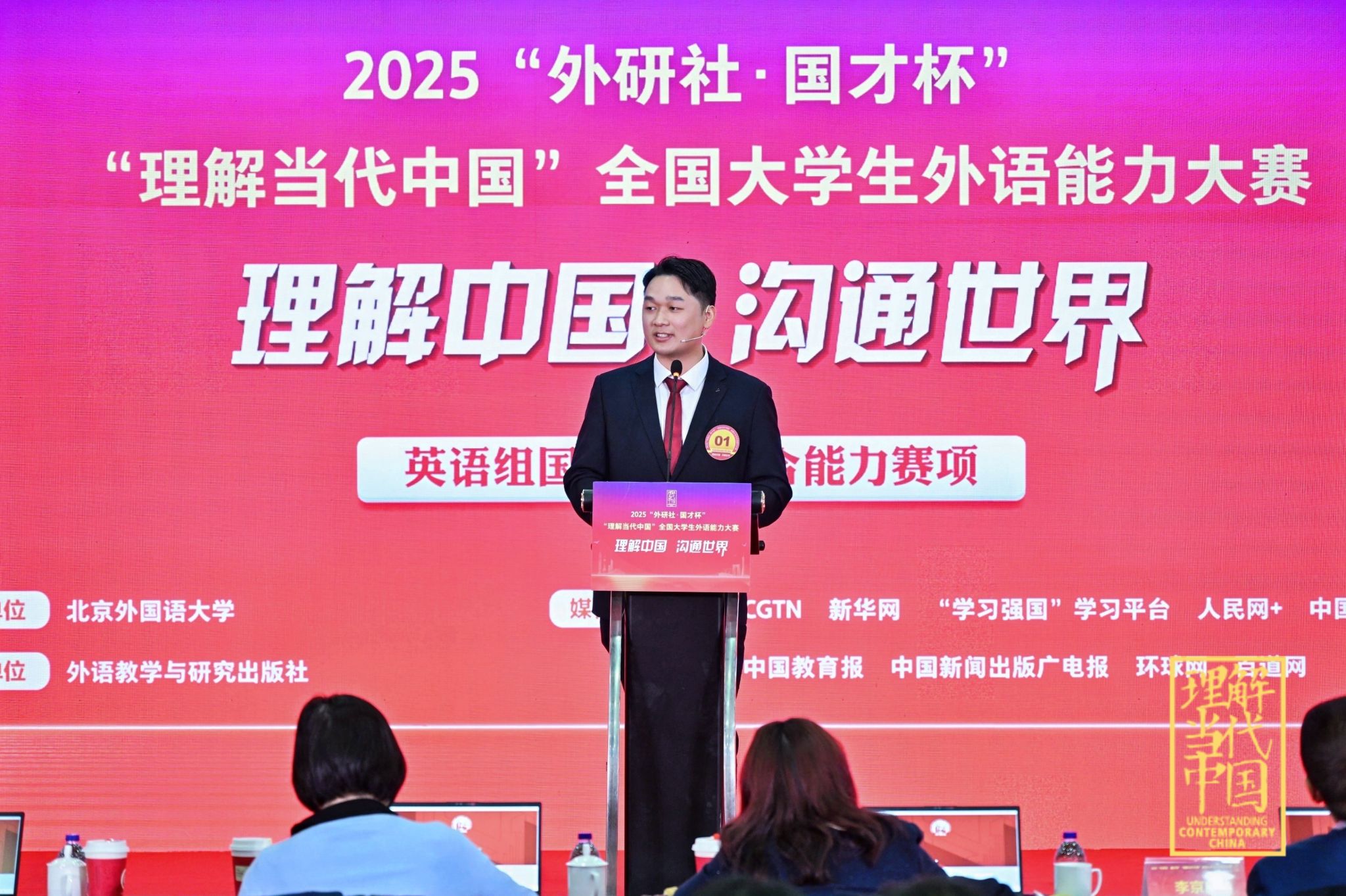 “外研社·国才杯”“理解当代中国” 全国大学生外语能力大赛英语组国际传播综合能力赛项国赛于11月22日启动,设计“阐释中国话语”“讲述中国故事”“贡献中国智慧”“提出中国方案”四个阶段。王浩天从1109名选手中层层脱颖而出,通过书面综合考查、定题演讲与即兴问答等各类考查,跻身全国60强,斩获全国金奖。指导教师为陈亦挺、诸葛文婵、李小燕。